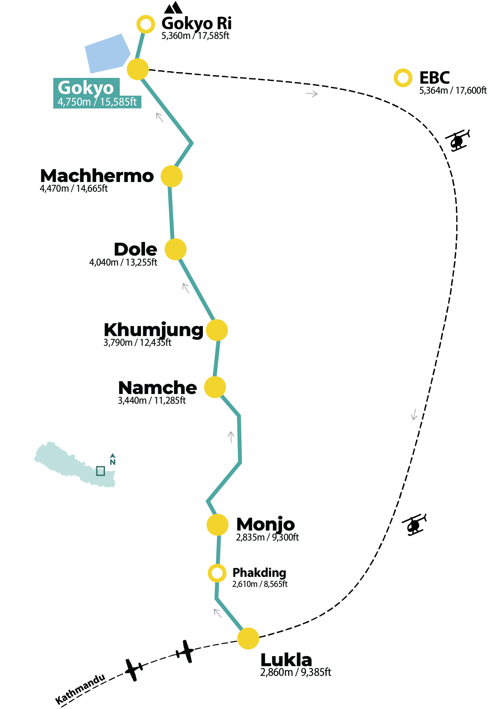 | 8 | Gokyo - fly over Everest Base Camp and Kalapthhar - Lukla [Heli] |